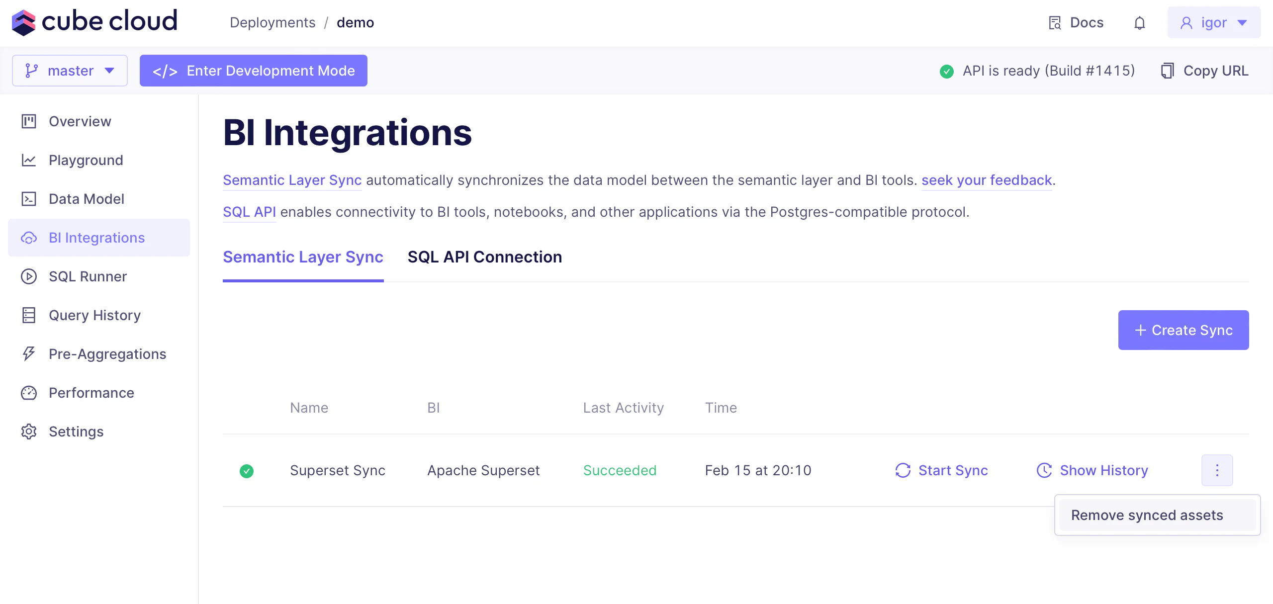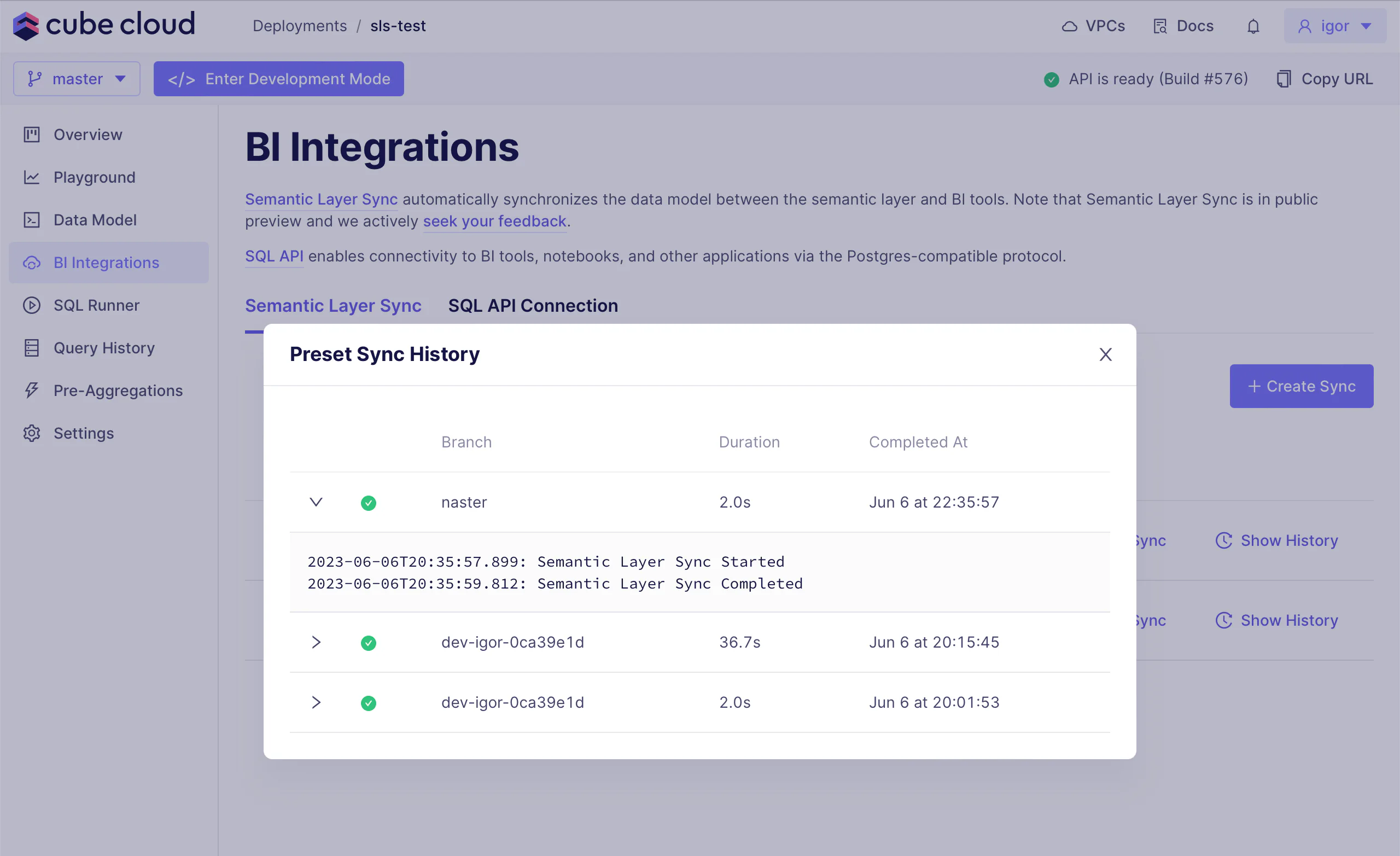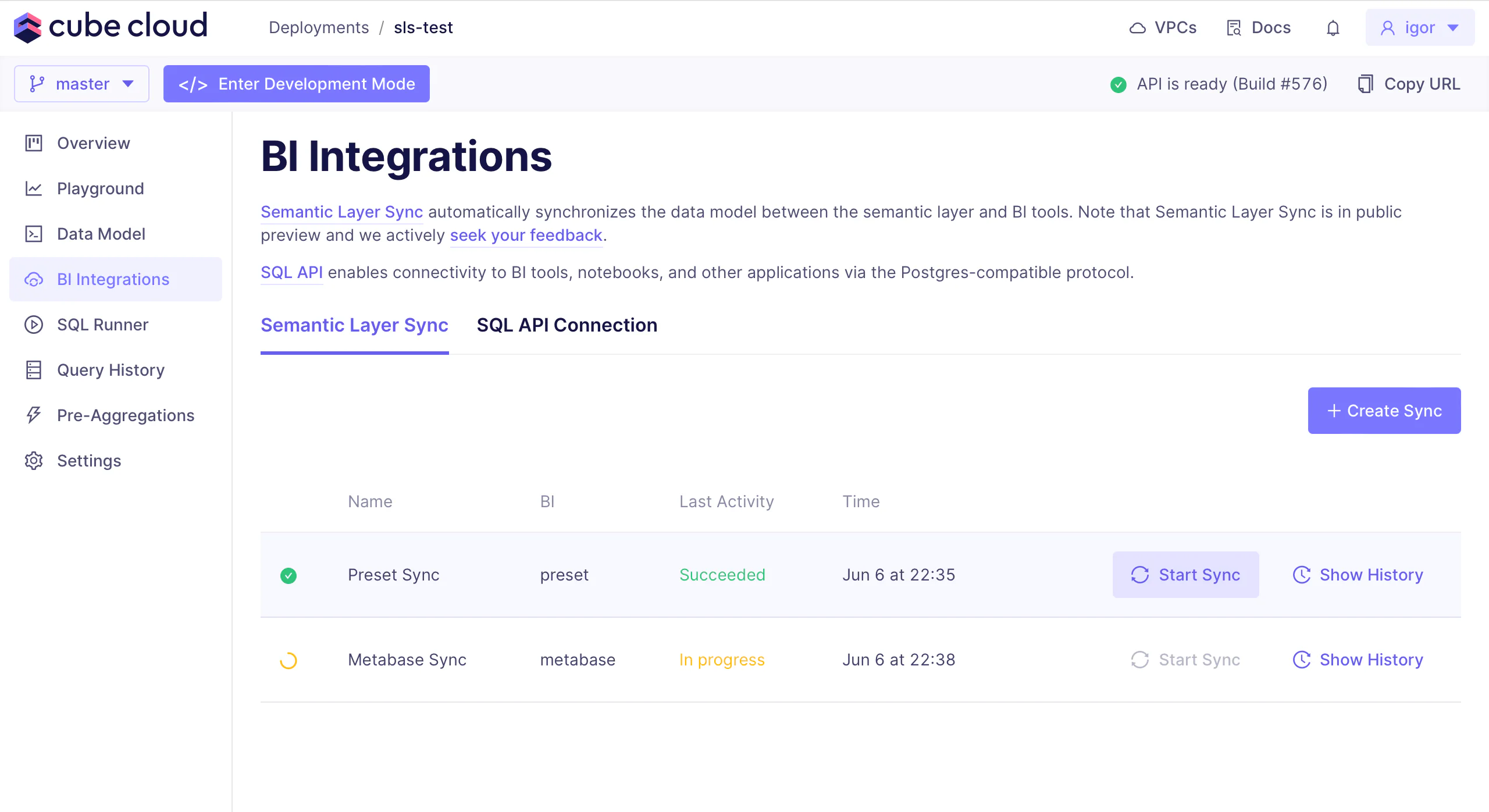 During the sync, Cube will either create from scratch or update a database in the corresponding BI tool and the data model associated with it. Syncing a branch in development mode will create a separate database, leaving the one associated with the production branch intact.