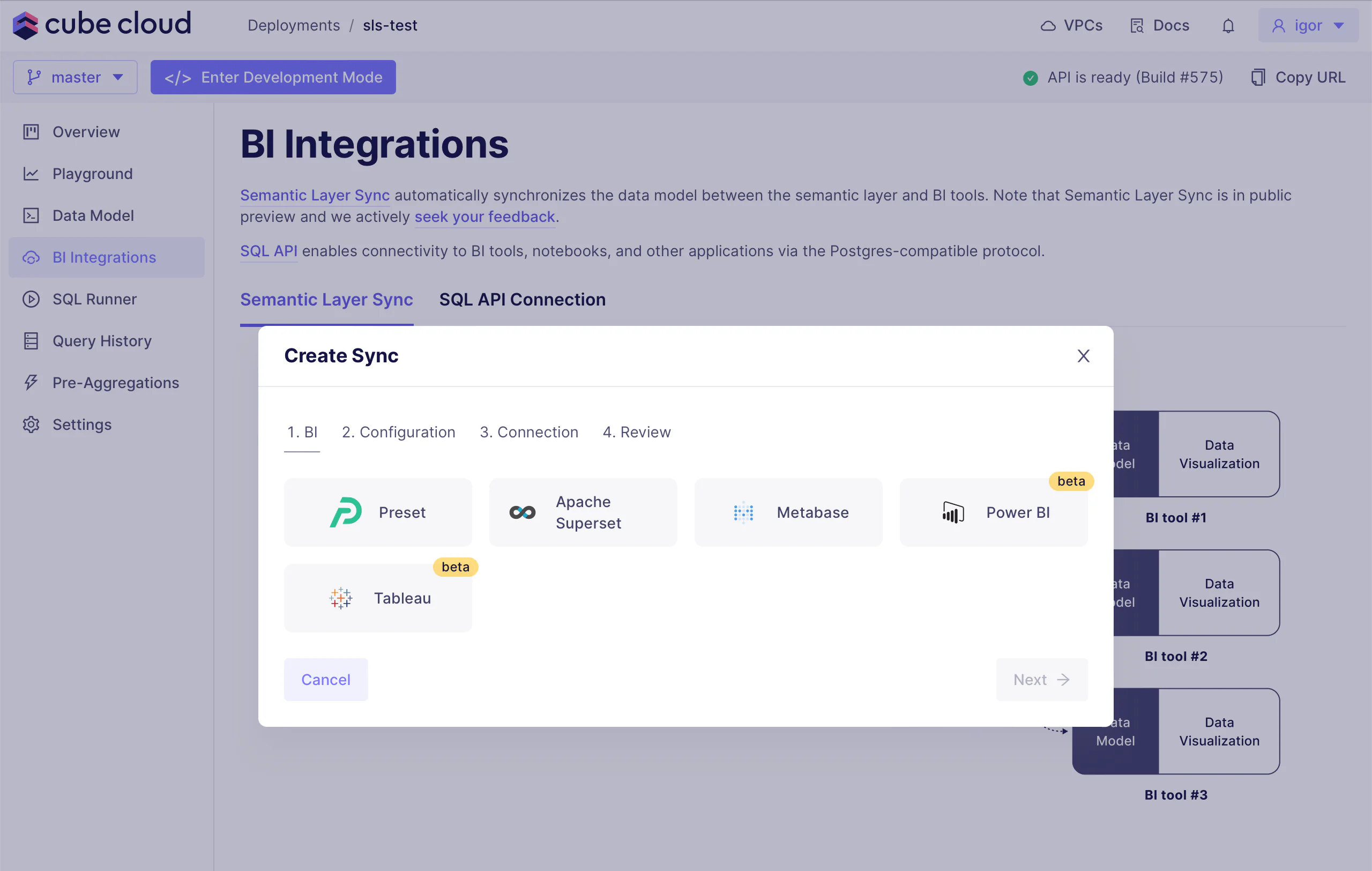 Follow the steps in the wizard to create a sync with any of supported BI tools.
