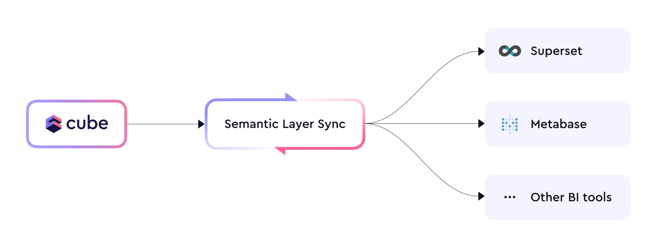 Semantic Layer Sync programmatically connects a BI tool to Cube via the SQL API and creates or updates BI-specific entities that correspond to entities within the data model in Cube, e.g., cubes, views, measures, dimensions.