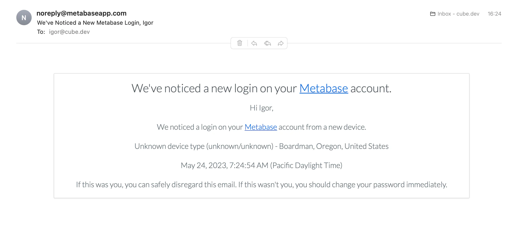 }When a sync is run, Metabase will send an email with a new login notification. You can ignore such emails, configure Metabase to skip sending them, or use a service account with a different email address: